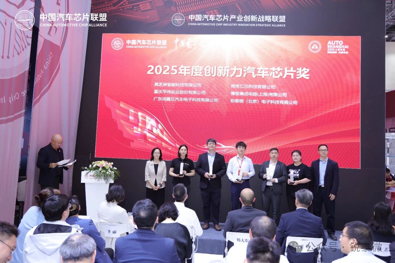 2025 年 4 月 25 日下午,"2025 中国汽车芯片产业创新成果" 颁奖仪式在 2025 上海国际车展 "中国芯" 展区隆重举行。本次活动由中国汽车芯片产业创新战略联盟携手中国电子报共同主办,吸引了来自北京、上海、广州、深圳、苏州、无锡、重庆等全国多地的 104 个项目踊跃参与创新成果申报。经过严格评审,锐泰微凭借C³ Lync SerDes芯片系列-串行器M66S68芯片及解串器M65Q68芯片,从众多优秀项目中脱颖而出,一举斩获 2025 年度创新力汽车芯片奖。该奖项旨在表彰技术领先、创新突出的汽车芯片产品,要求获奖产品不仅在关键性能指标上达到或超越国际先进水平,填补国内技术空白,同时还需具备广阔的市场应用前景,得到下游客户的高度认可。